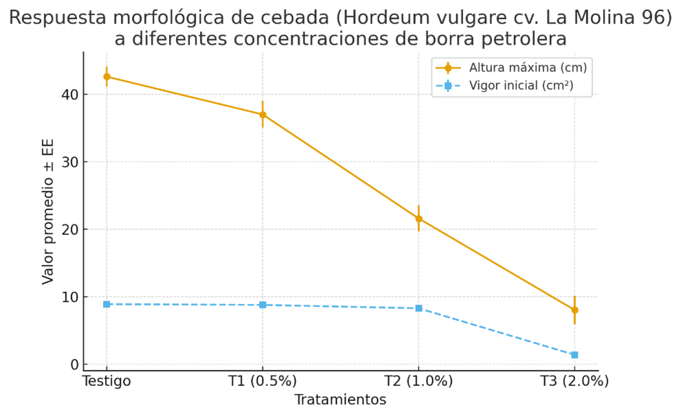 La contaminación de suelos agrícolas con residuos de petróleo representa una amenaza para el desarrollo vegetal y la productividad agroecológica. El presente estudio tuvo como objetivo evaluar la respuesta morfológica de la cebada (Hordeum vulgare cv. La Molina 96) y la quinua (Chenopodium quinoa cv. La Molina 89) frente a diferentes concentraciones de borra petrolera en el suelo. Se empleó un diseño completamente aleatorizado con seis tratamientos (0 %, 0.5 %, 1 %, 2 %, 4 % y 6 %) y tres repeticiones por tratamiento, bajo condiciones controladas. Se midieron variables morfofisiológicas como altura, número de hojas, longitud foliar, número de granos (en cebada) y área foliar estimada. Los resultados mostraron que ambos cultivos no germinaron a partir del 4 % de contaminación. La cebada presentó reducciones de hasta 81 % en altura y 84 % en área foliar con 2 % de borra. La quinua germinó en todos los tratamientos, aunque a 2 % su altura se redujo un 87 % y el número de hojas cayó un 90 %. Se concluye que la borra petrolera genera un efecto fitotóxico severo en ambas especies, siendo la quinua relativamente más tolerante, permitiendo sugerir su uso potencial en suelos contaminados o como especie bioindicadora.