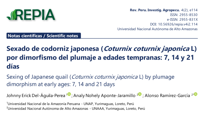 This study aimed to evaluate the accuracy of sexing Japanese quails (Coturnix coturnix japonica) using sexual plumage dimorphism, in order to identify the earliest age at which sex can be determined with high certainty. The research was conducted at the Poultry Experimental Unit of the National Agrarian University of La Molina (UNALM), using 2,700 newly hatched quails artificially incubated. Three sexing assessments based on plumage coloration were conducted at 7 (T1), 14 (T2), and 21 (T3) days of age, through direct observation: females were identified by the presence of black arrowhead-shaped spots on their breasts, while males had uniform beige plumage. The birds were raised until 35 days, at which age sex was confirmed with 100% certainty to validate previous results. Statistical analysis using the chi-square test (χ²) showed significant differences between T1 and T2, as well as between T1 and T3, while no significant differences were found between T2 and T3. These results suggest that sexing by plumage dimorphism is adequate from 14 days of age (T2) and is most reliable at 21 days of age (T3).